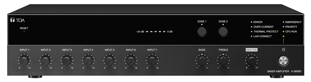 Dòng tăng âm số liền Mixer A-3600D của TOA là tăng âm PA được trang bị với 4 ngõ vào micro và 3 ngõ vào phụ, công suất 480W x 2 vùng, thêm vào đó là các chức năng như điều chỉnh âm lượng, ưu tiên, chuông reo, xác nhận từ xa. Dòng tăng âm này còn bao gồm ngõ vào BUS 2 kênh BUS 1 và BUS 2 và chức năng xử lý tín hiệu.
