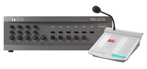 VM-2240 bộ trung tâm 240W có 5 vùng loa trong hệ thống VM-2000. Thiết bị all-in-one gồm Mixer, 5 vùng loa kèm công suất và num tinh chỉnh âm lượng, ngõ ra loa 100V Line, hỗ trợ 4 Micro chọn vùng từ xa