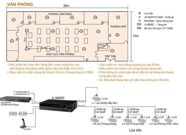 Hệ thống âm thanh thông báo, nghe nhạc thường có những thiết bị đơn giản, yêu cầu đối với thiết bị này đạt được mức độ hoạt động tốt, chất âm nhẹ nhàng, đơn giản. Ở phần sau, CEMCO sẽ gợi ý cho khách hàng một hệ thống âm thanh tiêu biểu để lắp đặt trong văn phòng.