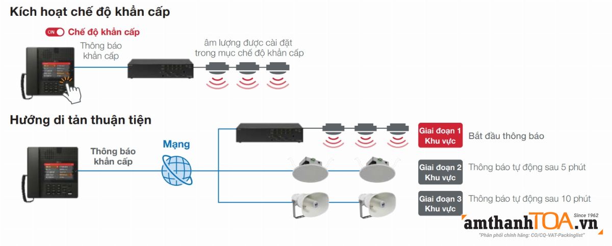 Trong các tình huống khẩn cấp như xâm nhập trái phép hoặc thiên tai, chế độ khẩn cấp sẽ được kích hoạt thông qua tín hiệu điều khiển hoặc thao tác trên thiết bị. Thông báo khẩn cấp lúc này được ưu tiên cao nhất hơn tất cả các chức năng khác, kể cả chiết áp được kết nối với các tăng âm như CX-PA1120 và CX-PA1240 cũng sẽ được bỏ qua để mức âm lượng phát ra như trong cài đặt ở chế độ “Audio Scene Emergency – Âm thanh khẩn cấp”. Hệ thống phát thông báo di tản theo ba giai đoạn với các bản tin riêng biệt, khu vực thông báo hay ngõ ra điều khiển. Các thiết bị sẽ tự động ưu tiên cuộc gọi, thông báo và xử lý tín hiệu, đồng thời toàn bộ thông báo khẩn cấp sẽ được ghi âm lại.